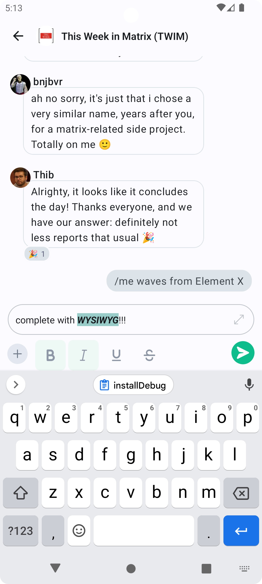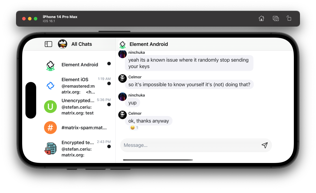 We are making progress on ElementX, which is a new client using the Matrix Rust SDK and Jetpack Compose. This app is now able to display a timeline and send messages to a room using the wysiwyg composer.