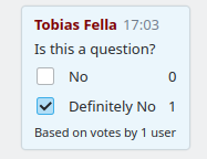 Polls! They are useful for quickly gauging whether a group of people agree, or entirely disagree on a topic or choice. This is an MSC with a fairly long history, but has received experimental implementation in a small number of Matrix clients. The concept uses Extensible Events, and there are plans to rewrite it off the back of changes in MSC1767 (extensible events). But for now, it works and is a fun feature.