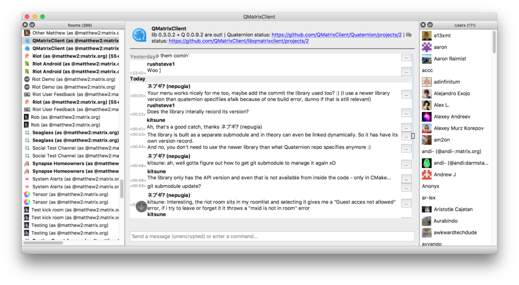 Quaternion 0.0.9.2 is out, another step towards 0.1. Aside from bugfixes and using the latest libQMatrixClient, it features an entirely new timeline layout similar to that of Riot (the old one is still around too). Also, you can now change some settings through the menu rather than by editing a configuration file or registry - including switching timeline layouts on the fly!