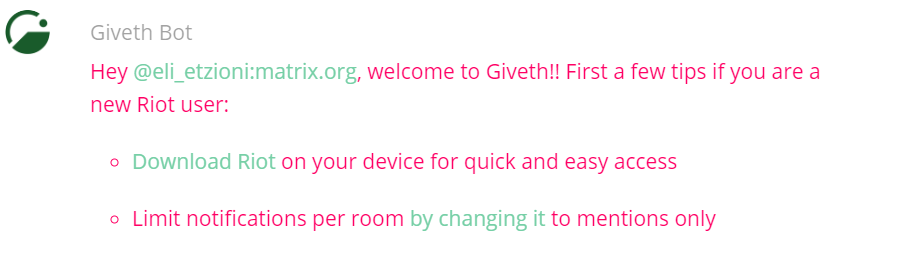 Giveth began by using Slack, but switched to Riot to support Matrix's decentralized, open-source model, which which aligns far more with Giveth's own business model and values. The Giveth Bot is a great example of how Matrix enables users to build their own solutions to problems. In the future, we hope that the Giveth Bot will be able to interact directly with the Ethereum Blockchain, and that more analytics and measurement tools can be incorporated. And of course, we welcome any and all feedback on the Giveth Bot!