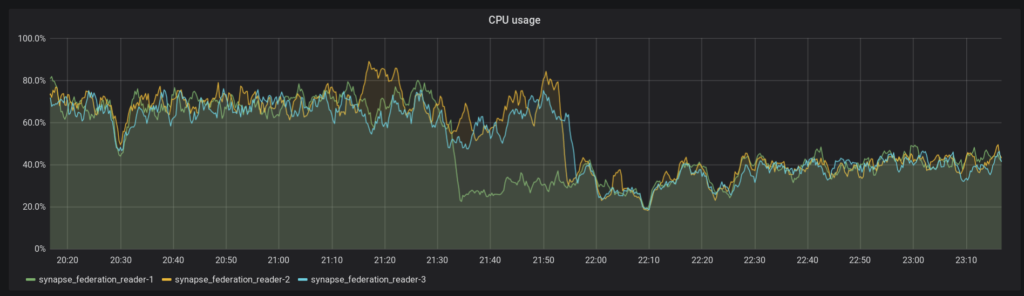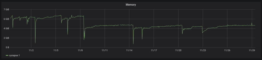 Synapse master on matrix.org, again the drop in RAM signifies the roll over to python 3