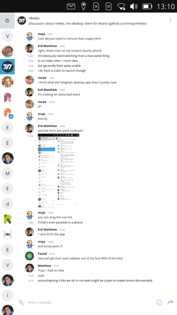 Now the next step here would obviously be to tweak the app properly to layout on a phone (bigger fonts; bigger buttons; resize the window to make room for the OSK; separate the Left Panel from the timeline view; etc) - but the point here was more to show a fully fledged native Matrix client running on a current Linux Phone environment and see how it feels.  And we're happy to say that it leaves us dying to get our hands on a proper Librem5 so we can work with Nheko, uMatriks, libqmatrixclient and all the other native Matrix client projects to see how we can get the best possible native client experience running in PureOS for the phone!!